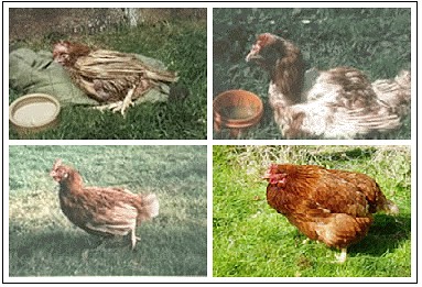 笼鸡终其一生都在空间十分狭小的层架式铁笼里度过,它们甚至无法伸展翅膀,而且被迫日夜站在倾斜的铁架上,足部因深陷其中而痛苦不堪。由于不断地摩擦铁笼,鸡只的羽毛也严重脱落,身体到处都是淤青与擦伤。加上这些笼子充满氨气,灼伤鸡的眼睛,甚至造成失明。此外,它们一出生,鸡喙就被剪断,致使许多小鸡因为惊吓过度或失血过多而在24小时内死亡,有些小鸡则完全丧失鸡喙,而无法进食。