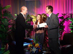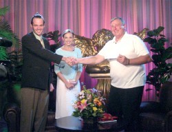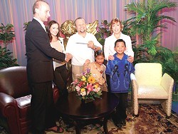世界会会员代表清海无上师致赠一万美元给“重新还给孩童组织”创办人兼会长罗伯特.克拉兹全先生(中),他的妻子朵拉奇雅(右)及收养的儿童 |