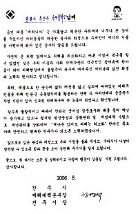 清海无上师世界会惠鉴: 虽然面对如此重大的天灾,我们却能将损害减至最小的程度,并在短暂的时间内迅速复原,这都归功于贵会在灾区日以继夜的牺牲奉献,以及附近居民和所有社会阶层人士的积极参与。 许多绝望的灾民因台风而顿失所有,幸赖中央及地方政府、军方及市民一同携手合作,投入紧急救灾工作,让灾区得以迅速复原。 突发的局部性豪雨及台风等天灾似有渐增的趋势,晋州市将尽力做好重点管理及各项防护措施,使灾害损失减到最小,以营造一个安和乐利的城市。 往后也请继续关爱照料晋州市,使我们的城市日益繁荣。 最后,谨祝