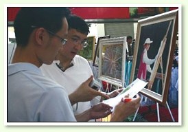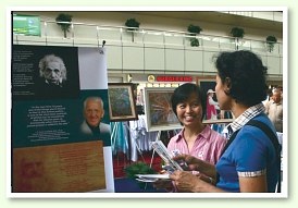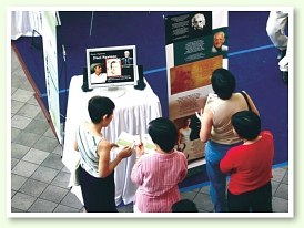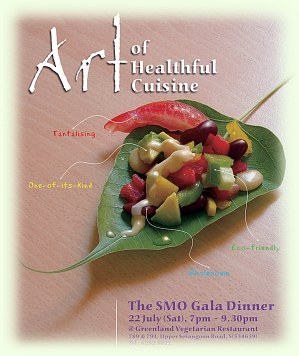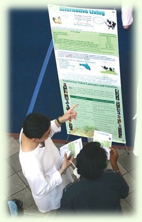 特展从早上十点到晚上十点持续了一整天,我们以师父的法相、万岁灯、画作和一些盆栽植物,将租来的场地布置得简单大方又美轮美奂,同时设置了三部电视,放映新加坡素食协会事先提供的影片《更美好世界之种子》(Seeds for a Better World),并放置了一部电脑,播放茹素名人的幻灯片。此外,我们也与大众分享素食的好处和营养价值,并向他们推介颇受好评的素食餐饮业者。