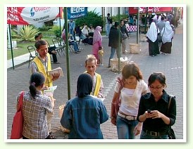 日惹、万浙地区(Banjarnegara)及斯拉根(Sragen)的同修们满怀喜悦地分工合作,一起筹备这场大规模的参展活动;雅加达与泗水小中心也鼎力相助,提供经书、杂志、DVD等出版品及“您也可以选择这样的生活”传单。同修们从8月22日至28日举办通宵打坐,以期对师父与众生做出最佳的贡献,并在活动期间注入祥和的气氛。 虽然我们的重点是分发“您也可以选择这样的生活”传单,但也设立一个摊位展示师父的书籍。我们注意到许多不同背景与年龄层的人自然而然地被师父法相所吸引,并有不少人专注地观赏师父的开示影片。 每天都有一些人询问有关打坐与茹素的生活方式。有位来自印尼东部东努沙登加拉省(Nusa Tenggara Timur)的大学生,致电联络人想学打坐,他很乐意吃全素,并遵循所有的印心规定。