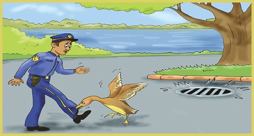当温哥华的义警雷.彼得森(Ray Petersen)走在格兰弗街桥下时,有一只鸭子衔住他的裤脚,企图引起他的注意,然后在他的四周走来走去,嘎嘎地叫着。因为他不精通鸭语,便赶走那只鸭子。 不过,那只鸭子确定彼得森先生还在看着她,便走到稍远的下水道栅栏坐下来。当彼得森先生想要走开时,那只鸭子再度衔住他的裤子,然后又走到栅栏处。这次彼得森先生紧跟着她,去看看为什么她会如此激动;原来她的八个宝宝从栅栏处掉入水中,她正尽全力找人解救他们。 彼得森先生赶紧打电话给警方,警方派了两位警员与拖吊车将栅栏拉起来,鸭妈妈则坐在不远处留神观察。终于鸭宝宝一只只地用洗菜的滤水盆救了上来。当所有的宝宝们都安全救上来时,鸭妈妈带着他们走到附近的溪旁,一起跳入水中。 真是只聪明的鸭子!真是个好妈妈! 参考资料:http://www.all-creatures.org/stories/a-duckhelp.html