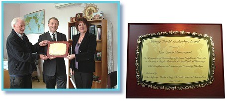 在颁发此项奖章时,我们还致上清海无上师亲笔签名的信函,函中略述了纽西兰政府的卓越政绩。7月21日,纽西兰外贸部长菲尔.高芙先生(Honorable Phil Goff)在他的办公室代表纽西兰政府欣然受奖。 我们也送给菲尔.高芙先生“您也可以选择这样的生活”传单,并告诉他有关师父及同修们在世界各地推广爱心素食生活方式的活动。 由于纽西兰许多地区的农场经营者遭到洪患之苦,我们藉此机会询问高芙先生,是否可以鼓励有意愿的经营者运用即将发放的灾难补助金,将农场的经营形态改为生产蔬食。这将鼓励他们生产有机蔬食,或耕种可提供替代能源的植物,来补充石油及天然气的供应。我们确信一定有一些农场经营者愿意改变,而不再因循旧有的养殖动物的经营方式。