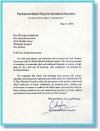 黄金3年(2006年)7月,纽西兰政府受邀接受清海无上师颁赠的“全球优秀领导奖”。此一奖项之颁发,是为了表彰实施英明政策,对促进世界和平、提升众生福祉有卓越贡献的政府。 纽西兰政府能获得此一殊荣,是因为下列政绩:1996年制定“危险物质及新生物法案”的管理规范(Hazardous Substances and New Organisms Act),来管理基因改造生物(Genetically Modified Organisms);立法让纽西兰成为无核地区;立法裁减军备与武器控管;支持无数的国际条约及协议,包括世界人权宣言(Universal Declaration of Human Rights)、民权与政治权国际公约(International Covenant on Civil and Political Rights)、禁止核武繁衍协定(Nuclear Non-Proliferation Treaty)等(请参阅本刊第164期的报导)。