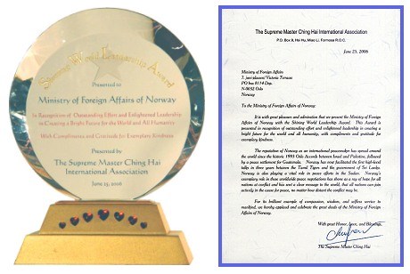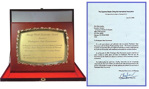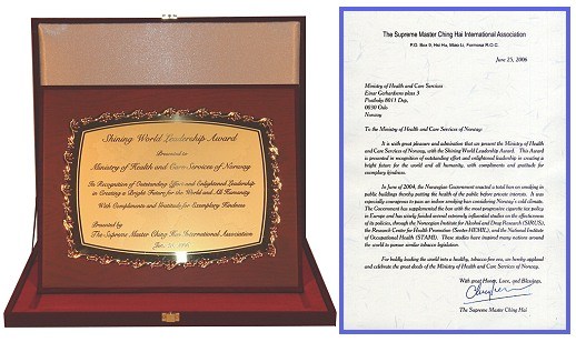 过去几个月来,藉由邮递的方式,美国华盛顿州和罗德岛州政府以及挪威的卫生保健部(Ministry of Health and Care Services),都收到了“全球优秀领导奖”奖章及师父的签名信函。颁发这些奖章,旨在表扬他们优先照顾人民的健康福祉,创造空气清新的环境,英勇地领导世界进入健康无烟的时代。此外,挪威外交部也同样收到了“全球优秀领导奖”奖章与签名信函,以表彰他们杰出的努力成果与英明的领导,为世界与全人类缔造一个光明的未来,同时对其典范善行表达敬谢之意。