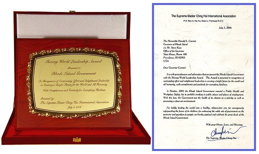 2005年10月,罗德岛州政府颁布了公共卫生与职场安全法(Public Health and Workplace Safety Act),禁止在公共场所与工作场所吸烟。 2006年8月接获这份殊荣之后,州长卡西里(Carcieri)向世界会的同修代表表示,能获颁这个奖项使他倍感荣幸。此外,他更进一步询问有关师父以及世界会的讯息,并邀请师父下次造访罗德岛州时,能莅临州长办公室,因为他非常想和师父见面。