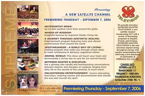 注:全球各地民众均可藉由网际网路,在线上观赏“无上师电视频道”的节目:http://suprememastertv.com/webtv/