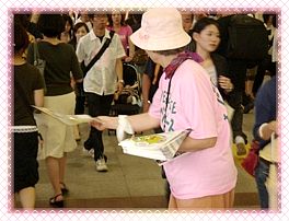 当天天气炎热,“您也可以选择这样的生活”扇子大受来宾欢迎,大家人手一扇,百扇摇曳,如同翩翩飞舞的蝴蝶。我们在会场上准备的蔬菜包子、豆浆奶茶、幸运饼干等食物,深受民众喜爱。一位在和歌山县经营素食餐馆的老板,在京都的一家素食餐馆里看到“您也可以选择这样的生活”传单,心里很感动,就从那家店拿了一些传单放在自己的店里。她向同修询问了关于“您也可以选择这样的生活”的推广活动和我们团体的一些问题。听了同修的解说后,她很感动地表示今后要和我们一起展开活动,她还说要购买“您也可以选择这样的生活”扇子和T恤衫,并希望在自己的店里放置传单。 在活动的第二天,我们又在京都的电车站前、繁华街道上、住宅街等地区分发了许多“您也可以选择这样的生活”传单。