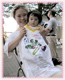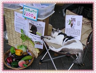 这次我们摊位的成员中最引人注目的,就是一对同修夫妇所救养的素食猫TOKI,TOKI的毛质光润,体态丰满,性情温和,散发出祥和的气氛,人们不由自主地轻轻摸摸它、抱抱它,那正是一幅人与动物和谐相处的理想画面。 此次参展团体之一“素食药膳坊”(VEGAN HEALING CAFE)的经营者折原昭博(Orihara Akihiro)先生,他同时也是一位有20年经验的赛车手及完全素食主义者,还是日本反皮草团体的代言人。他在此次活动中发言:“由于我选择了素食,使得体力、集中力、持久力都有很大的提升,素食对我的赛车事业帮助很大。为了消除类似‘素食者只吃蔬菜,会不会体力不够?’这样的误解,促使我参加此次活动。我向大家推荐素食,那是迈向胜利的选择。”他所经营的素食店是同修经常光顾的地方,我们也放置“您也可以选择这样的生活”传单在他的店里,供客人自由索取。